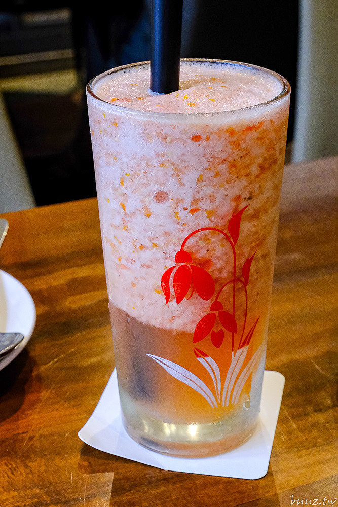 飲料有點了一杯「鮮榨蕃茄蜜」是由番茄搭配蜂蜜去鮮榨成果汁,番茄微酸加上蜂蜜甜味有點酸V酸V的感覺,用復古雕花杯裝著頗有懷舊感。