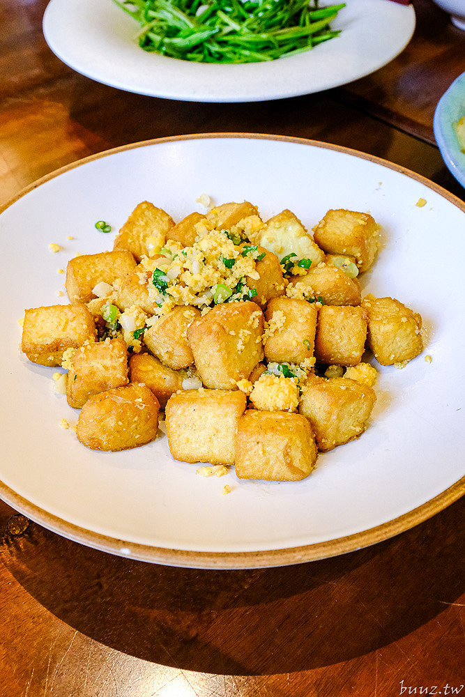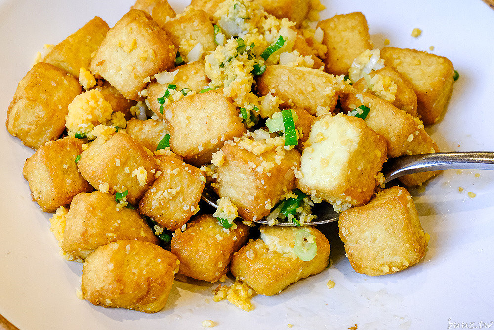 「金沙豆腐」也是老少咸宜的必點菜色!外表金黃的嫩豆腐類似老皮嫩肉,裹上了鹹蛋黃金沙醬,香鹹夠味,搭配蔥花吃起來不會太過膩口。