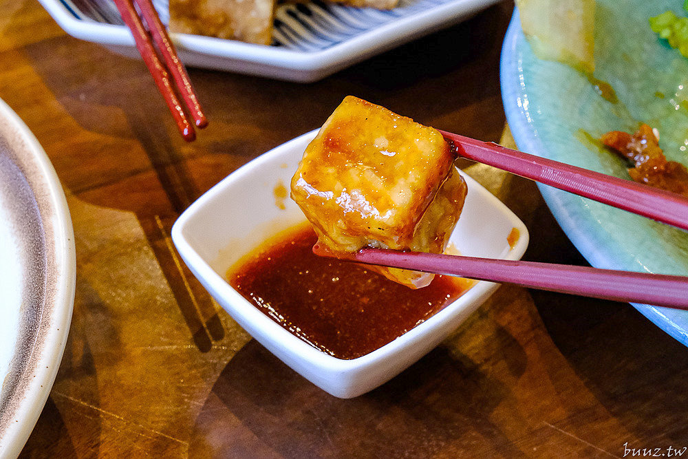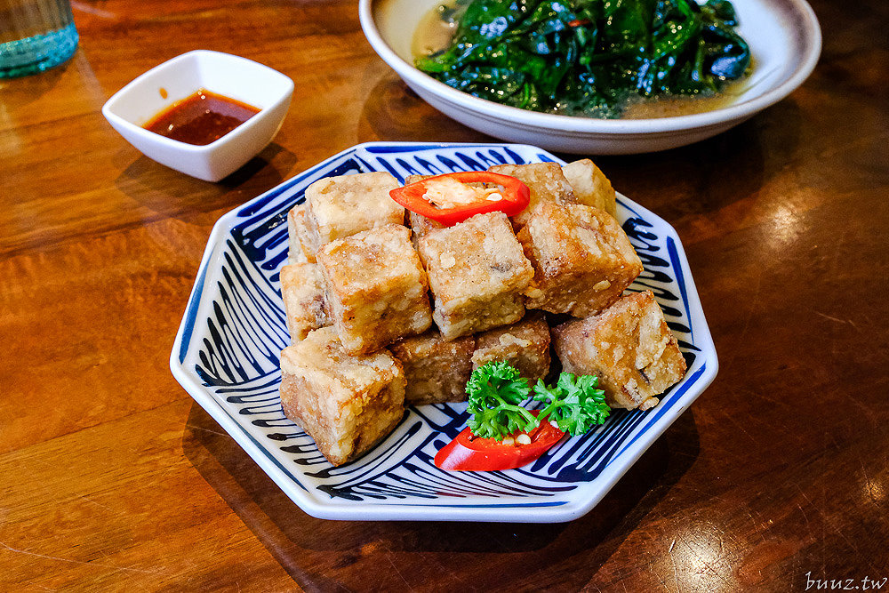 茶點的「骰子蘿蔔糕」則是把蘿蔔糕切成骰子狀,外皮煎得恰恰焦脆模樣,咬下去有點酥酥口感,裡面卻是軟糯香綿,簡單沾點蒜蓉醬,就能帶出蘿蔔糕本身的鮮味,當作開胃小點或配菜都很適合。