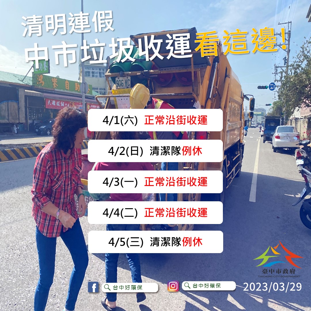台中市政府環保局公布中秋連假垃圾清運不打烊,中秋節當天9/25(五)採日間定點定時收運,9/30(六)是正常沿街收運,10/1(日)則是清潔隊則為例行休假,請市民提前掌握收運時間。。(相關新聞稿請參閱台中市府公告)