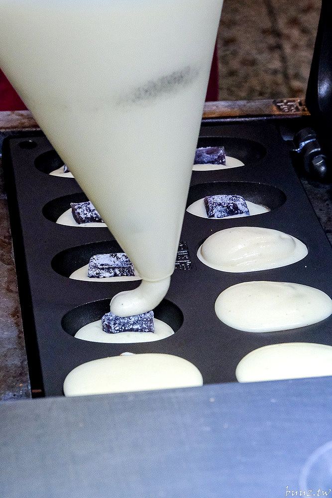 看著老闆穿著廚師服記著客人雞蛋糕口味,然後有條不紊地擠麵糊、加配料,翻轉雞蛋糕模具,彷彿在室內一派優雅做著甜點的感覺。