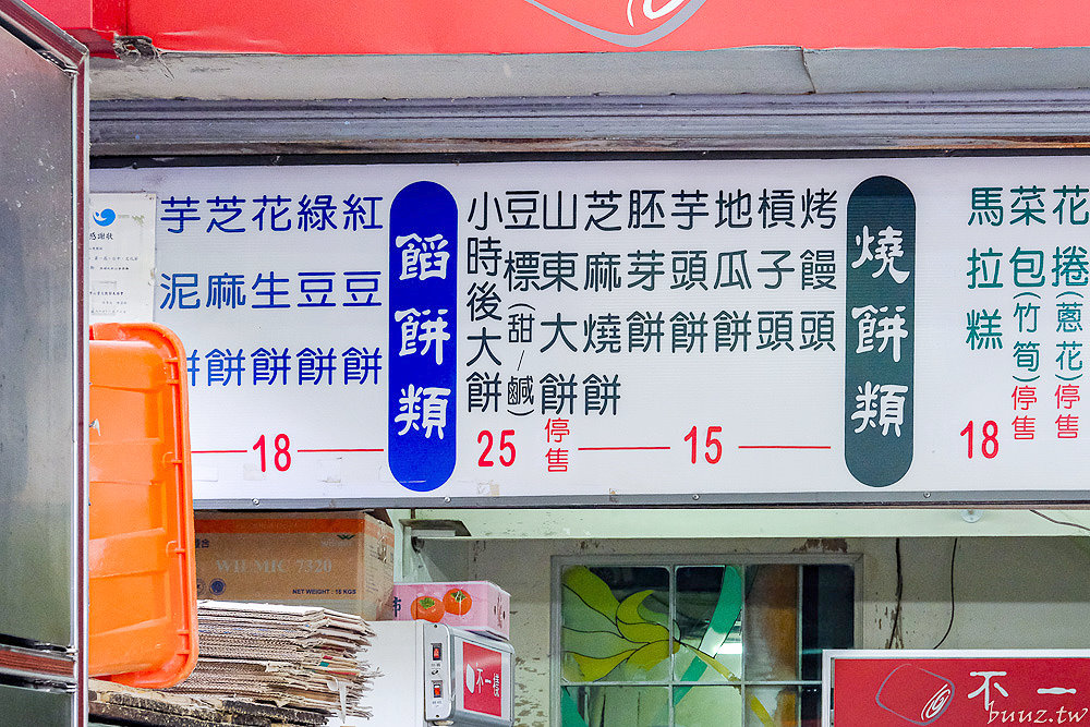 店面正上方有各式饅頭、燒餅、餡餅品項的價錢,山東大餅及包子類目前是停售中,其餘的饅頭、甜餡餅都在20元以內的銅板價。