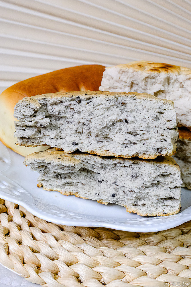 芝麻燒餅的部分有著黑色點點的芝麻,吃起來除了麵香之外,可以吃到芝麻顆粒感及芝麻香,稍微偏乾,適合配茶喝。