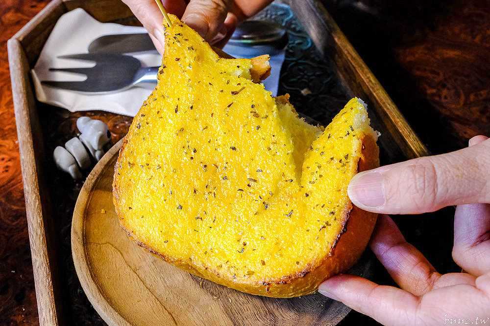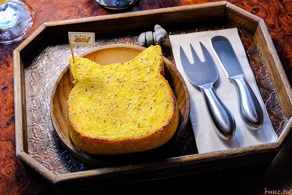 「蒜香貓咪吐司」是有著貓咪造型的蒜香厚片吐司,搭配端盤叉具看起來真的很可愛討喜,而且剛烤好熱熱的吐司上桌陣陣撲鼻蒜香,好香阿~