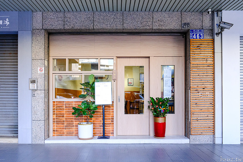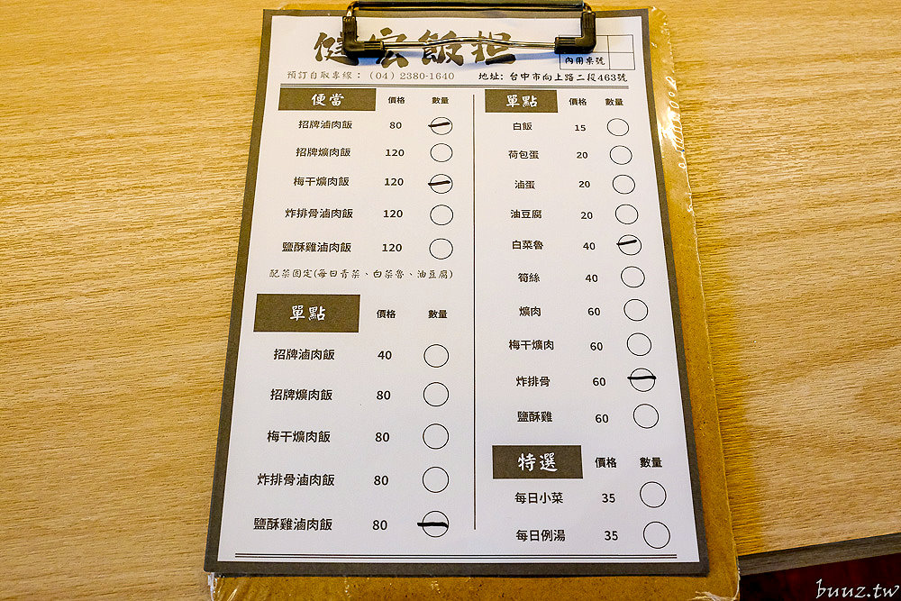 健宏飯担」就位在向上路二段與黎明路二段的熱鬧路口處,這邊車流量大,也聚集了許多餐館美食,「健宏飯担」有著白色黑字的招牌,加上簡約木質門面,看起來也挺清新的。