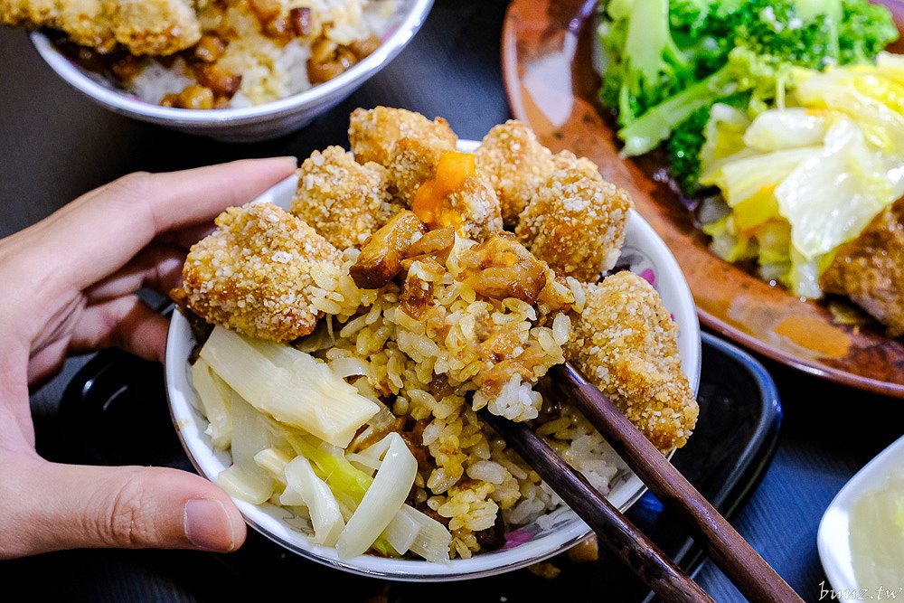 鹹酥雞滷肉飯,也就是一次能吃到滷肉飯跟鹹酥雞這兩樣國民小吃,香酥炸雞塊與粘嘴的肥肉醬汁交織,實在好邪惡又好滿足,哈哈哈!
