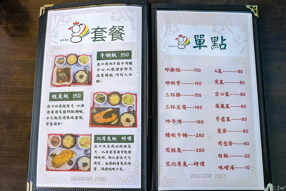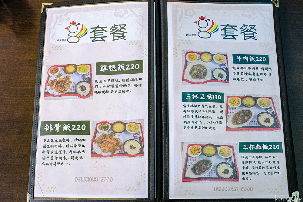 金G園的菜單設計,就如同它的店內氛圍一樣,沒有花俏的品名,而是直接了當地列出各式簡餐主食,讓人一眼就能掌握所有選擇,主打的是各種經典的台式簡餐,像是雞腿飯、排骨飯、三杯雞飯、鮭魚飯等。