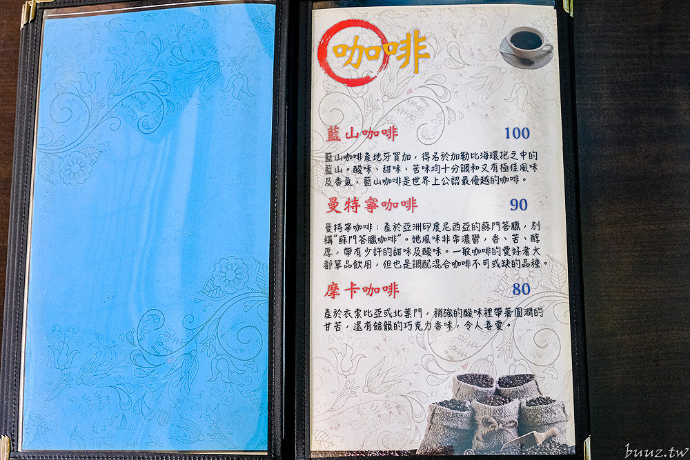 咖啡的部分則有藍山咖啡、曼特寧咖啡、摩卡咖啡、巴西咖啡、咖啡特調等選擇,百元以內的價位也是頗為親民,真的很有老派簡餐的樣子。