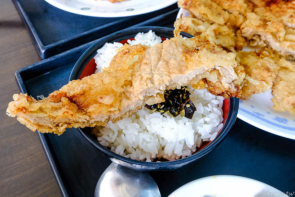 雞腿飯一上桌,香氣其實就蠻明顯的,麵衣微微酥脆,雞腿用著自家獨門醬料醃製過,咬下去裡面還保有肉汁,而且還有幫忙去骨,整體而言是很耐吃的類型。