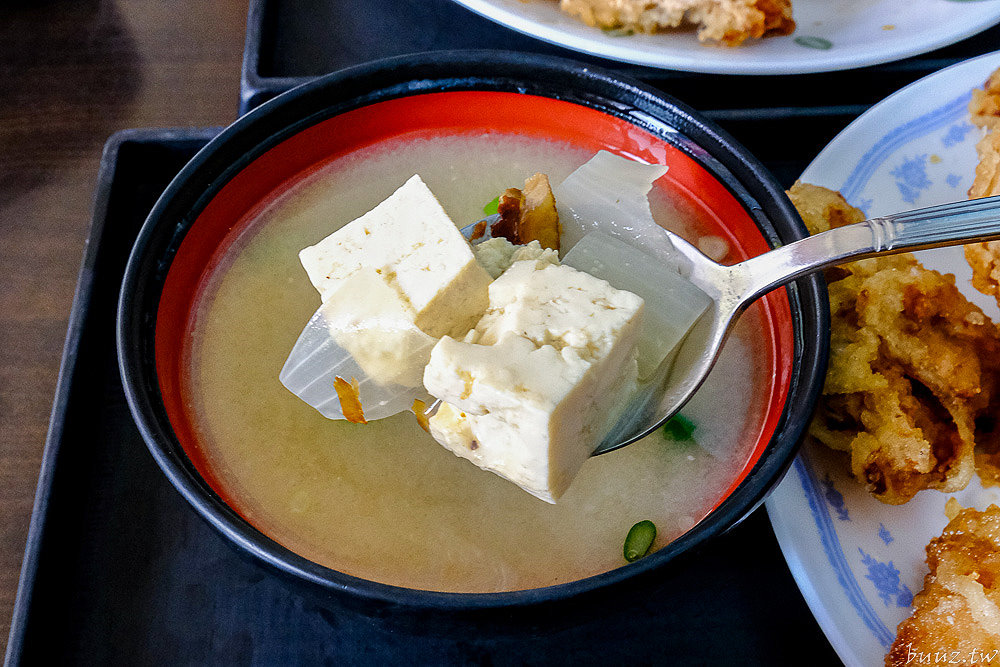 味噌湯則是家常風味,味噌發酵的甘味搭配柴魚片、洋蔥、蔥花點綴氣味,還有些許的板豆腐,喝起來不會太重鹹,整體吃下來是很有飽足感的組合。