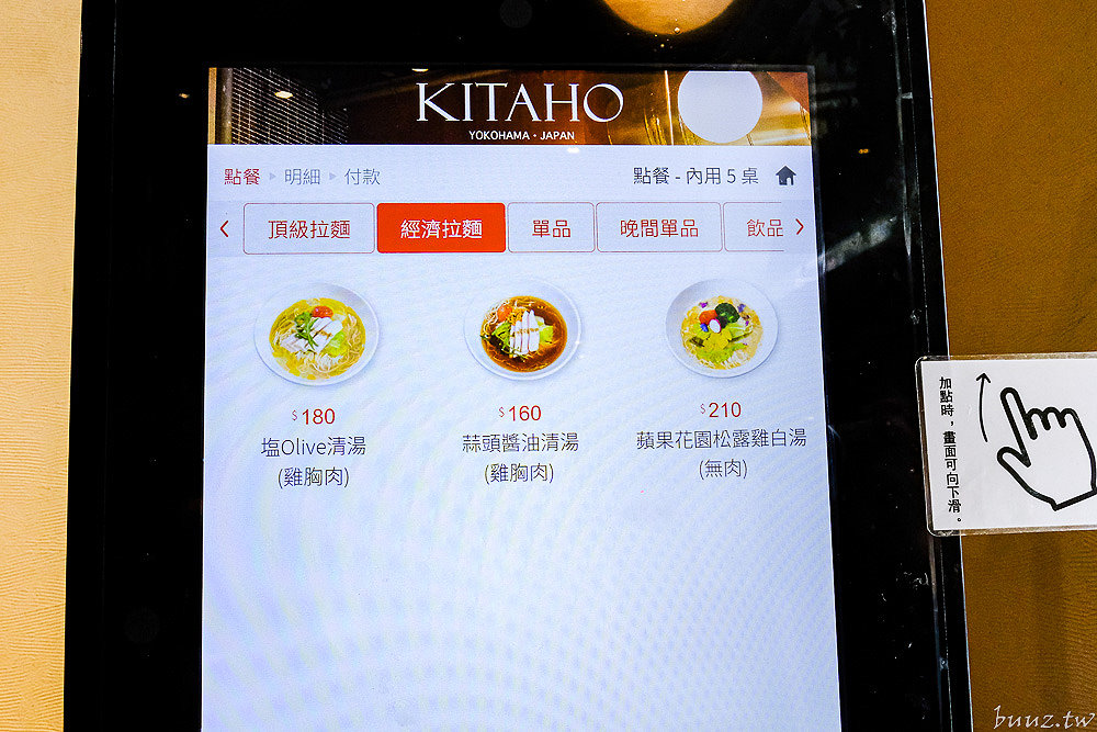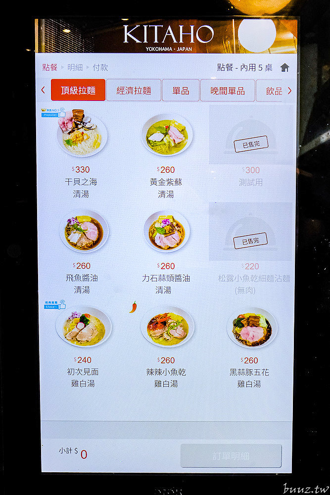 點餐方式是使用點餐機點餐結帳,第一頁有列出招牌的雞白湯系列,還有一些比較特別的限定拉麵口味,像是干貝之海、紫蘇清湯、飛魚醬油等。