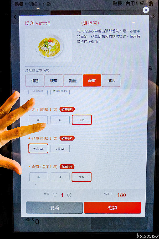 接下來還有加點的單點品項,最後再選擇拉麵的湯頭鹹淡、麵條硬度以及是否需要麵條加量。