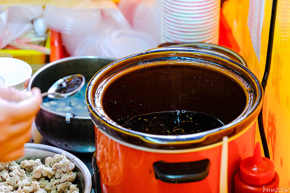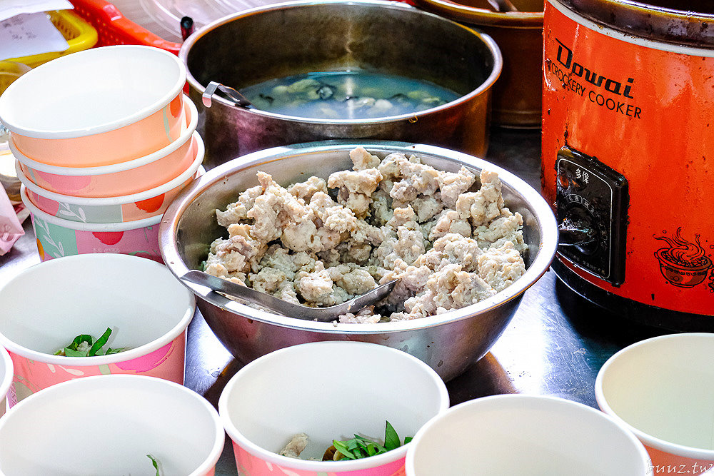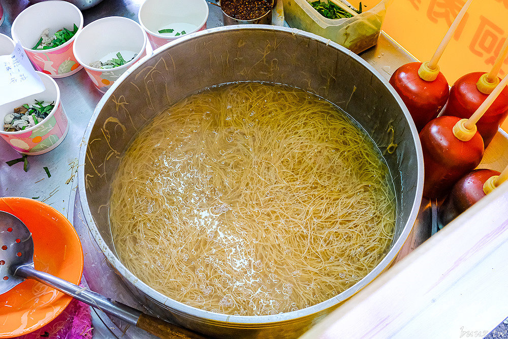 攤位上有著剛煮好熱騰騰的麵線,一旁則有肉羹、鮮蚵、大腸等配料,會依照客人點餐口味,依序先把配料先放進碗內。