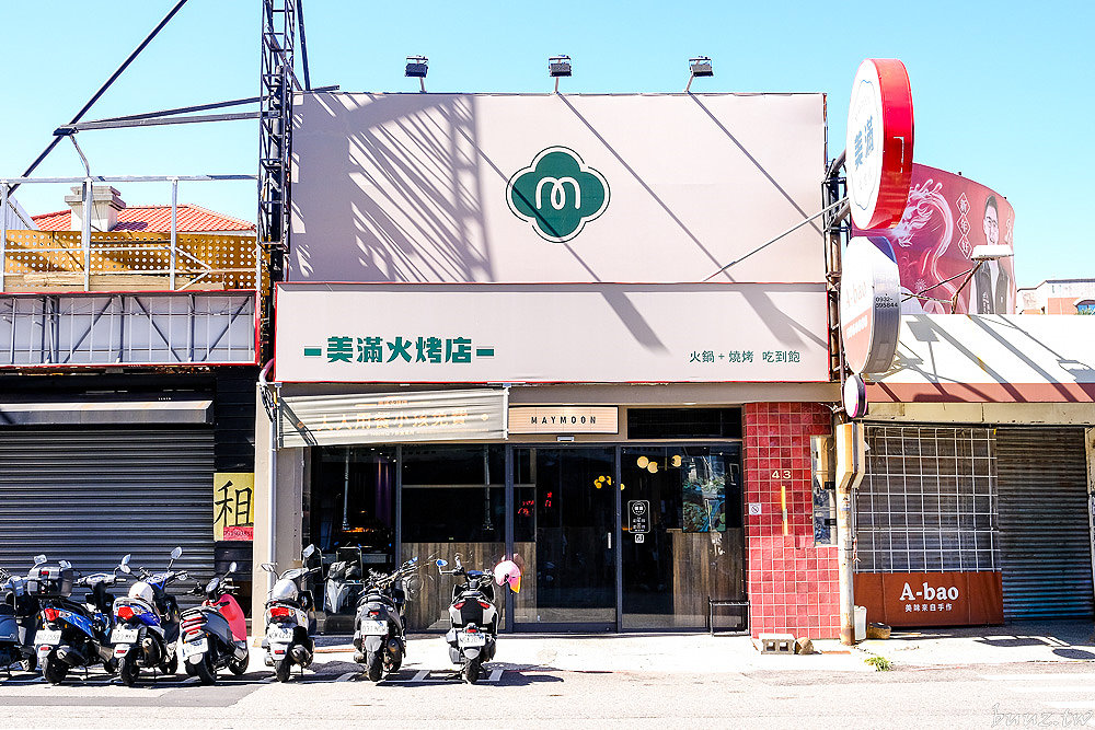 「美滿火烤店」座落於台灣大道Jmall商場及澄清醫院後方的福康路上,純白色的招牌搭配綠色的LOGO字樣,上頭還有標示火鍋+燒烤吃到飽,簡單又明瞭。