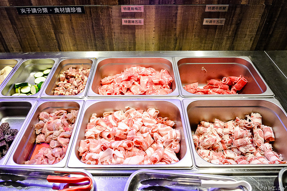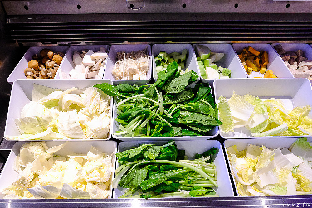 緊接著是火鍋食材,蔬菜區有供應多款新鮮蔬菜、菇類一應俱全,還有多樣化的火鍋料任君挑選,而且服務人員補食材這部分也很迅速,這點也很值得稱讚。