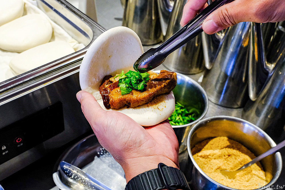 可以自己夾入著肥瘦適中的爌肉,撒上花生粉與香菜,大口享受台式漢堡的美味。