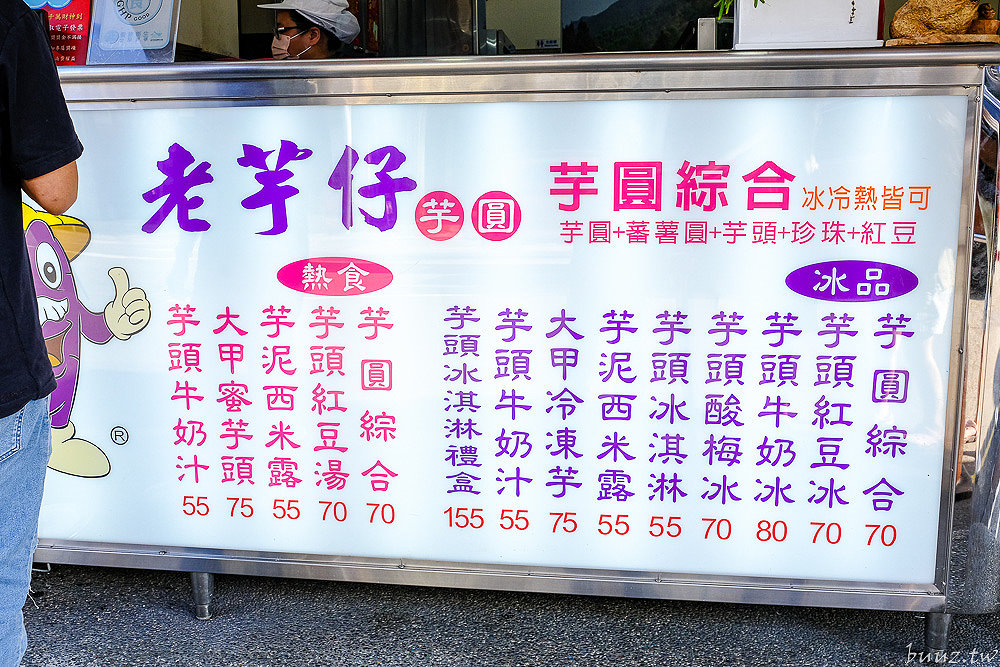 老芋仔的菜單相對簡單明瞭,主要分為冰品與熱湯兩大類。大約落在$50~$70元之間(實際價格以現場為主)。除了招牌的芋圓綜合外,店內還有地瓜圓、珍珠、紅豆、大豆等多種配料,如果是超級芋頭控,還可以選擇「冷凍芋」或是濃郁的「芋頭牛奶」。