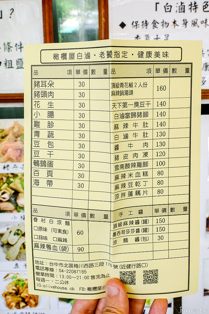 「橄欖屋白滷滷味」就位在北區梅川西路靠近健行路的位置,外觀看起來是一個簡單的店面攤位,店門口有著大帆布招牌,門口有擺放菜單跟滷味照片可以對照著看。